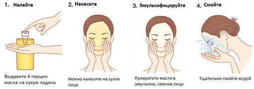 Средство нужно наносить сухими руками на сухую кожу. Помассировать лицо 1-2 минутки, смочить руки теплой водой и повторно помассировать лицо. При контакте с водой масло превратится в эмульсию и после этого смоется с кожи. После использования гидрофильного масла, вторым этапом очищаем коже пенкой или гелем для умывания.